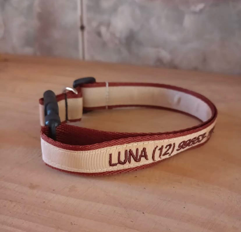 Coleiras de identificação bordadas para cães. Garanta a segurança do seu pet com acessórios personalizados, confortáveis e duráveis. Feito com amor desde 2020.